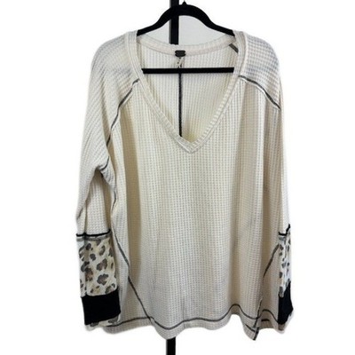 We The Free People Top Women's Size Medium Cream Waffle Leopard Cuff Shirt