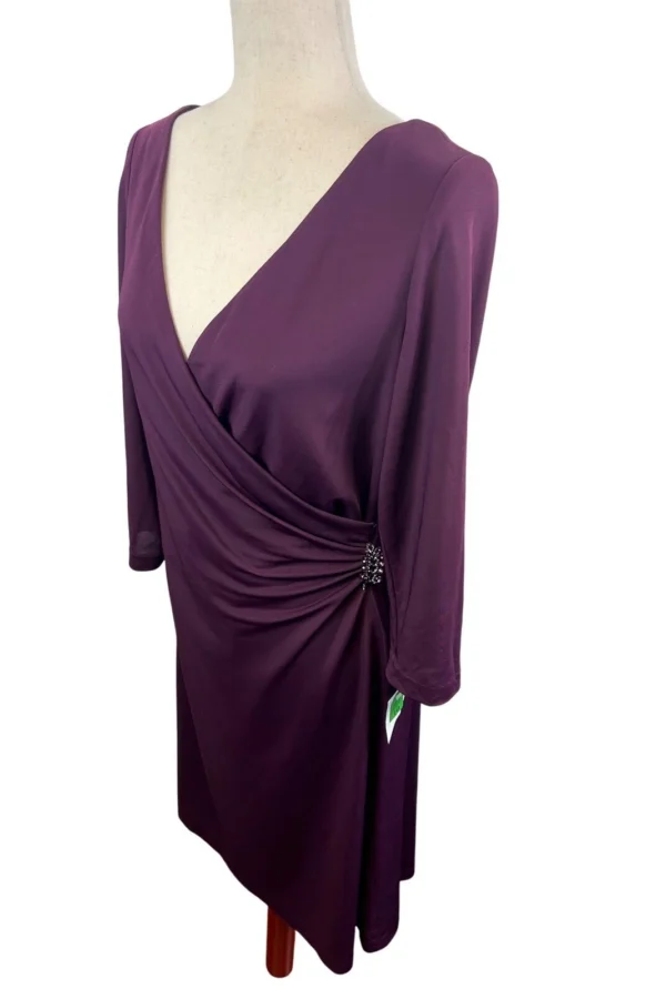 New Alex Evenings Party Dress Brooch Detail V-Neck Long Sleeve Plum Size 10