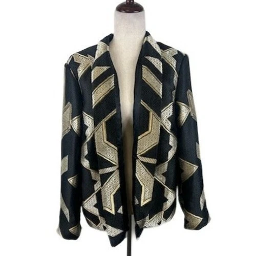 Chico's Black & Gold Geometric Open Front Jacket Blazer Career Party Size 2