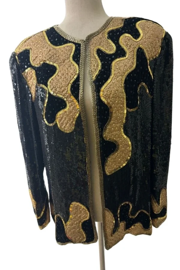 Judith Ann Creations Silk Sequin Vintage Jacket Top Black Gold Size Large