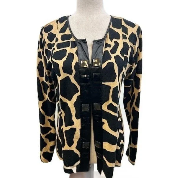 Berek Women's Medium Black Tan Giraffe Print Satin Trim Cardigan Sweater Y2K