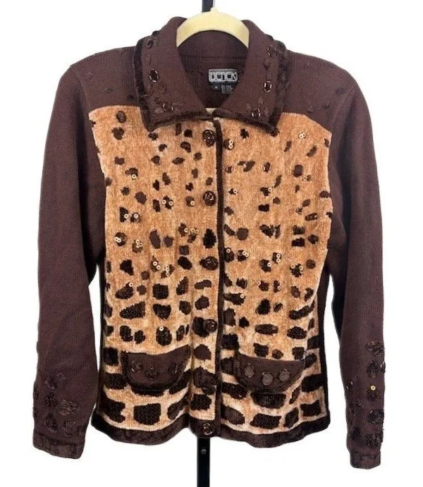 Berek Brown Leopard Sequin Embellished Cardigan Sweater Size Medium Y2K Vintage