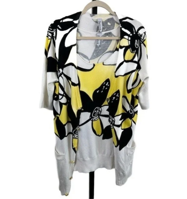 Berek Women's Size Large Yellow Black White Floral Knit Cardigan Sweater Set Y2k