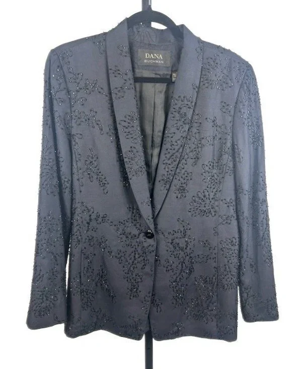 Classic Dana Buchman 100% Silk Blue Black Crystal Beaded Blazer Jacket Size 10