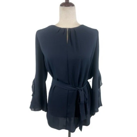 Halston Heritage Long Blouse Women's Size Large Navy Ruffle Sleeve Belted Top