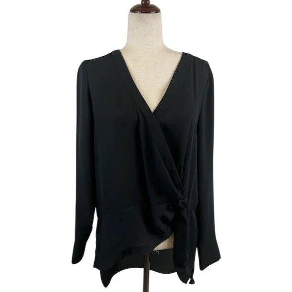 Halston Women's Size Medium Black Wrap Knot Front V-Neck Long Sleeve Blouse Top