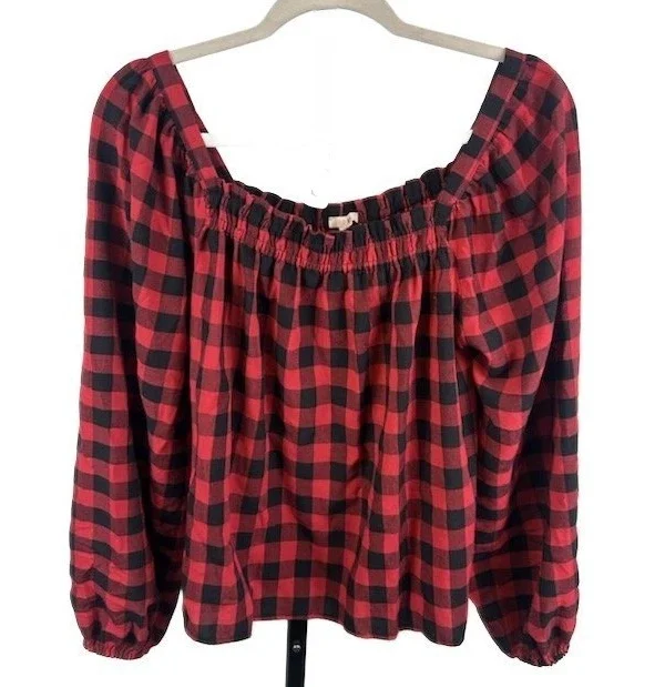 JODIFL Women's Size Small Red Black Buffalo Plaid Smocked Peasant Top