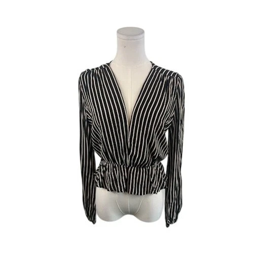 Reformation Striped Camila Blouse Long Sleeve Peplum Top Black White Size Medium