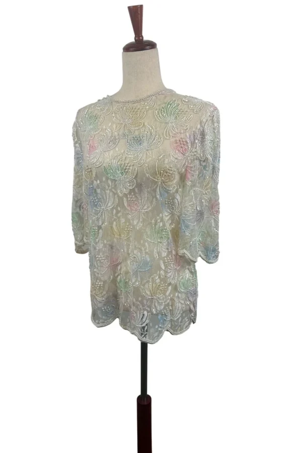 Scala Beaded Sequin Top Pastel Floral Party Cocktail Blouse Size Large Vintage