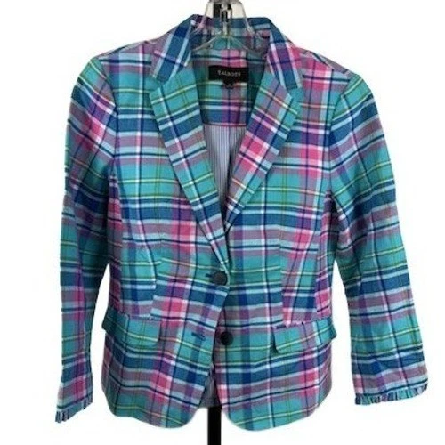 Talbots Women's Plaid Blazer Size 2 Blue Pink Green Jacket Multicolor Y2K