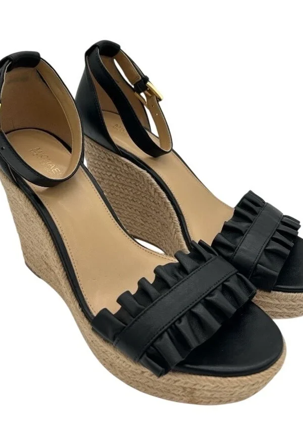 Michael Kors Black Leather Ruffle Espadrille Ankle Strap Wedge Sandals Size 7.5