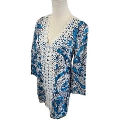 Lilly Pulitzer Tunic Top Crochet Trim Blue White Paisley Print Size Small