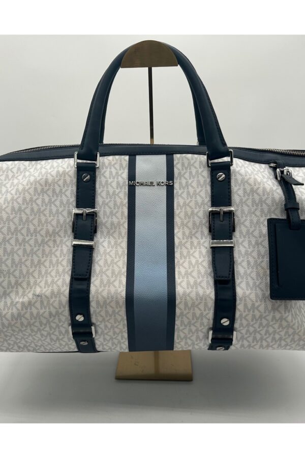 Michael Kors Cooper Duffle Bag Large White Navy Blue Logo Monogram Travel