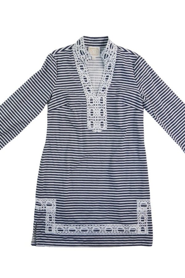 Sail to Sable Tunic Dress Womens Medium Navy White Striped Lace Trim 3/4 Sleeve