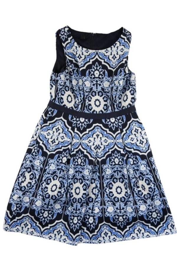 Talbots Fit Flare Dress Women's Size 10P Blue White Damask Tile Cotton