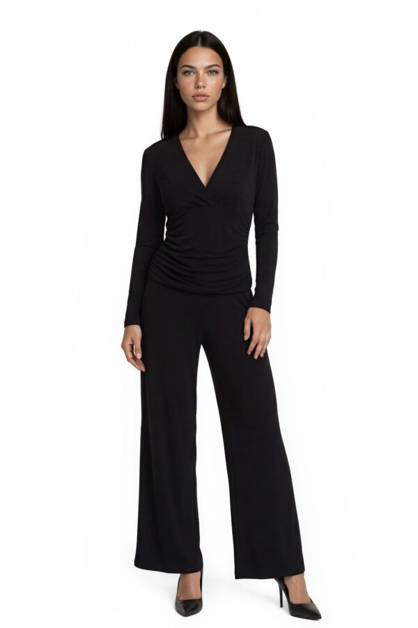 Norma Kamali Jumpsuit Women's Size Small Black Ruched V Neck Wide Leg