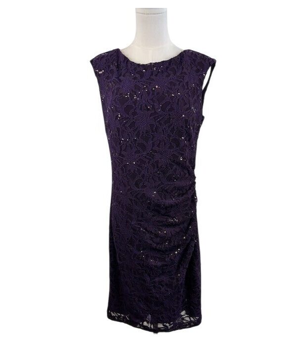 NWOT Ralph Lauren Purple Lace Sequin Dress Ruched Sleeveless Cocktail Size 12