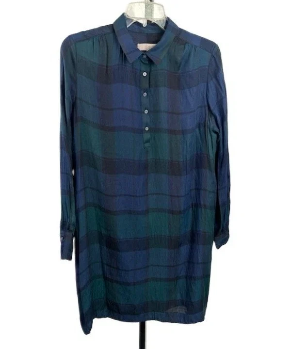 LOFT Plaid Shirt Dress Women's Size Medium Blue Green Long Sleeve Tartan Lined