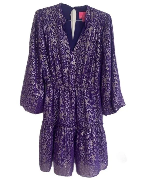 Lilly Pulitzer Purple Silk Gold Metallic Leopard Tiered Dress Holiday Size 12