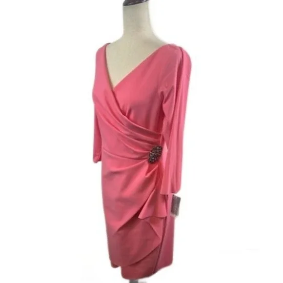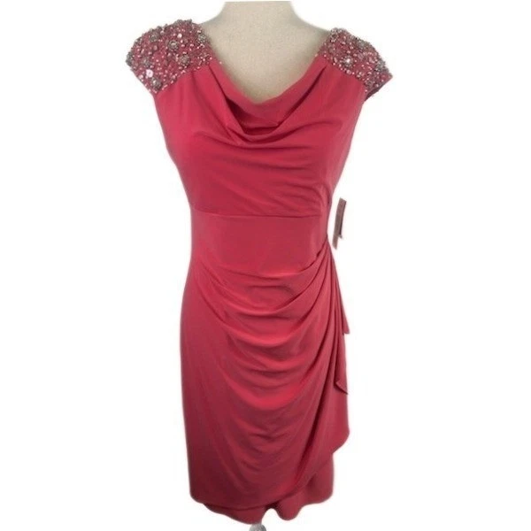 New Alex Evenings Pink Guava Crystal Beaded Shoulder Drape Dress Size 6