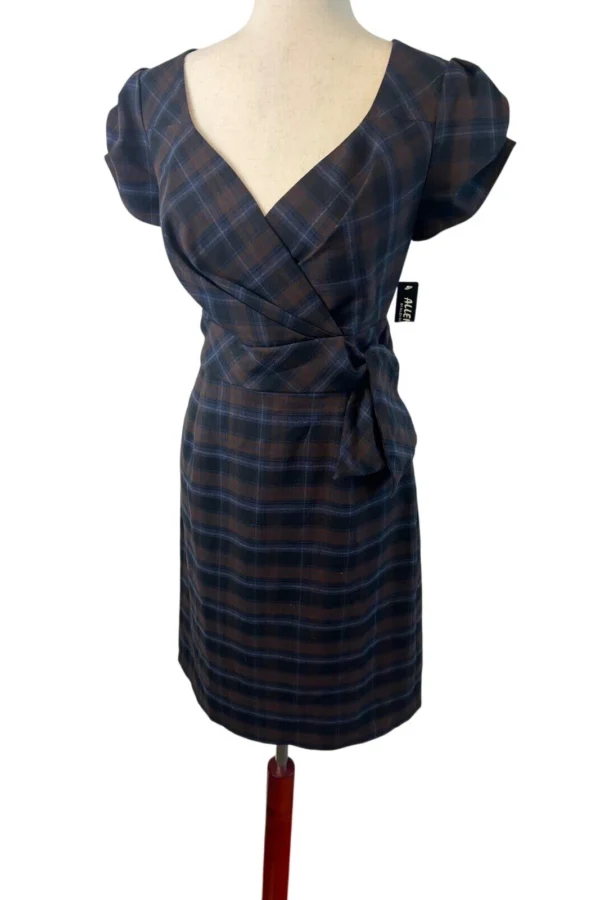 New Allen B Plaid Dress Puff Sleeve Career Party Brown Blue Size 10