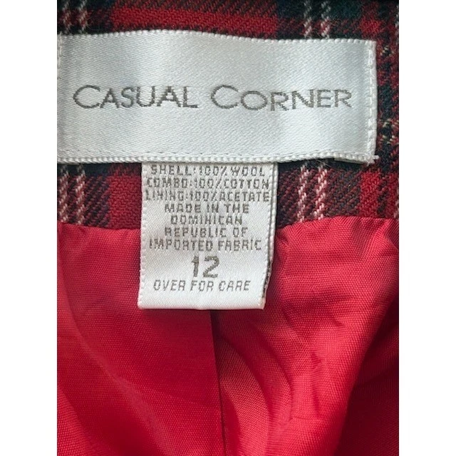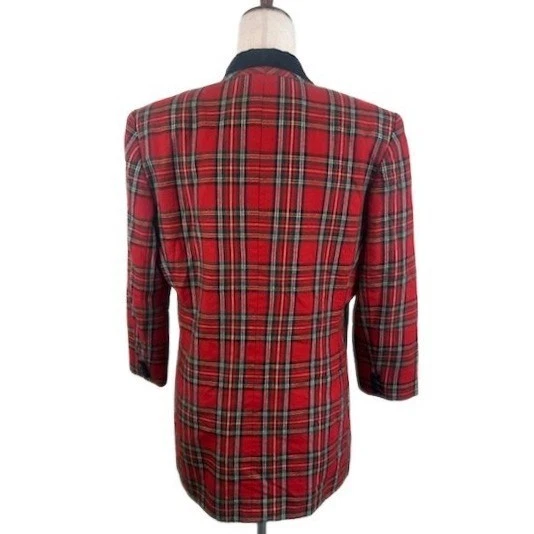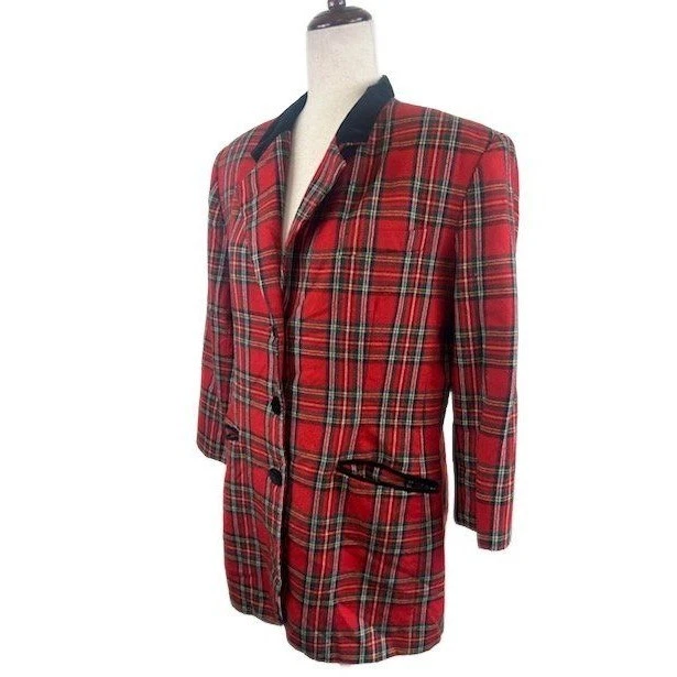 Vintage 80s Casual Corner blazer radiates timeless charm with its classic plaid pattern in vibrant red hues. This sophisticated blazer features a distinctive black velvet collar and trim pockets, adding a touch of luxury and refinement. The three-button front closure and tailored silhouette create a flattering fit. Versatile enough for a business-casual setting or a smart-casual weekend outing, this blazer also serves as a stylish layering piece for cooler evenings.