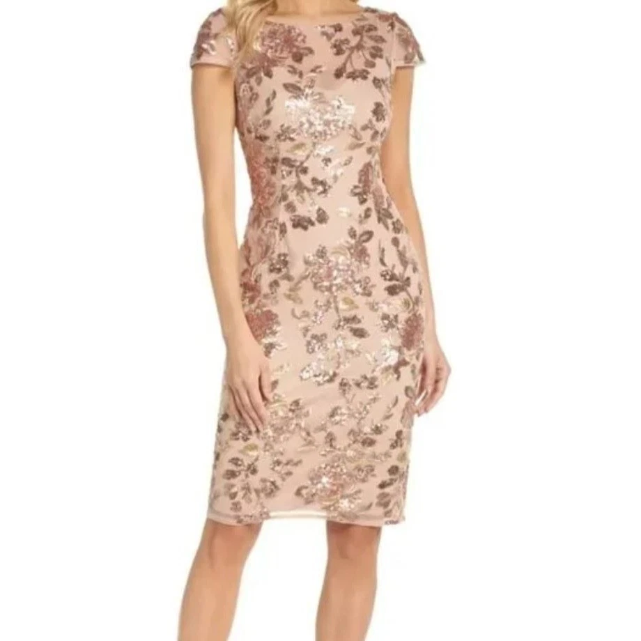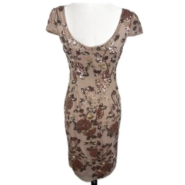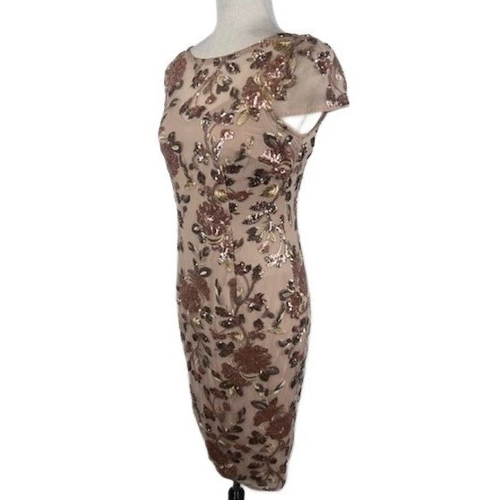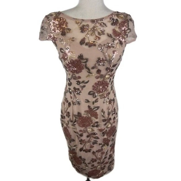 Elegant sheath dress by Adrianna Papell featuring shimmering sequins and delicate floral embellishments. This beautiful dress showcases a sophisticated silhouette designed to accentuate your figure. Its intricate detailing includes a mesh overlay adorned with a rich tapestry of floral designs, enhanced by the subtle sparkle of sequins. The dress has a round neckline and short sleeves, making it ideal for semi-formal and festive occasions. It’s perfect for attending cocktail parties, wedding receptions, or special evenings out where you want to make a lasting impression.