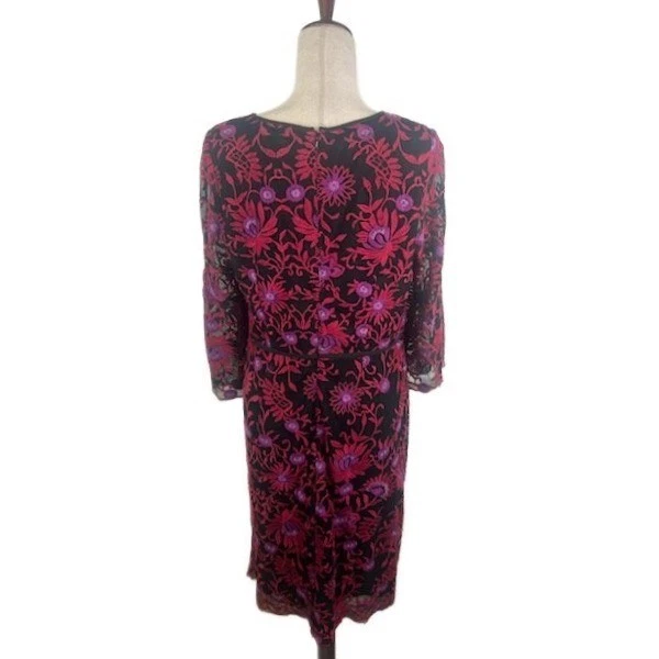 Sophisticated cocktail dress featuring exquisite floral embroidery. This elegant dress showcases a delicate overlay of red and purple floral patterns atop a sleek black base. The dress is designed with long sleeves and a flattering silhouette that falls just below the knee, creating a timeless and refined look. This dress is perfect for cocktail parties, evening events, or special occasions where you want to make a stylish impression.