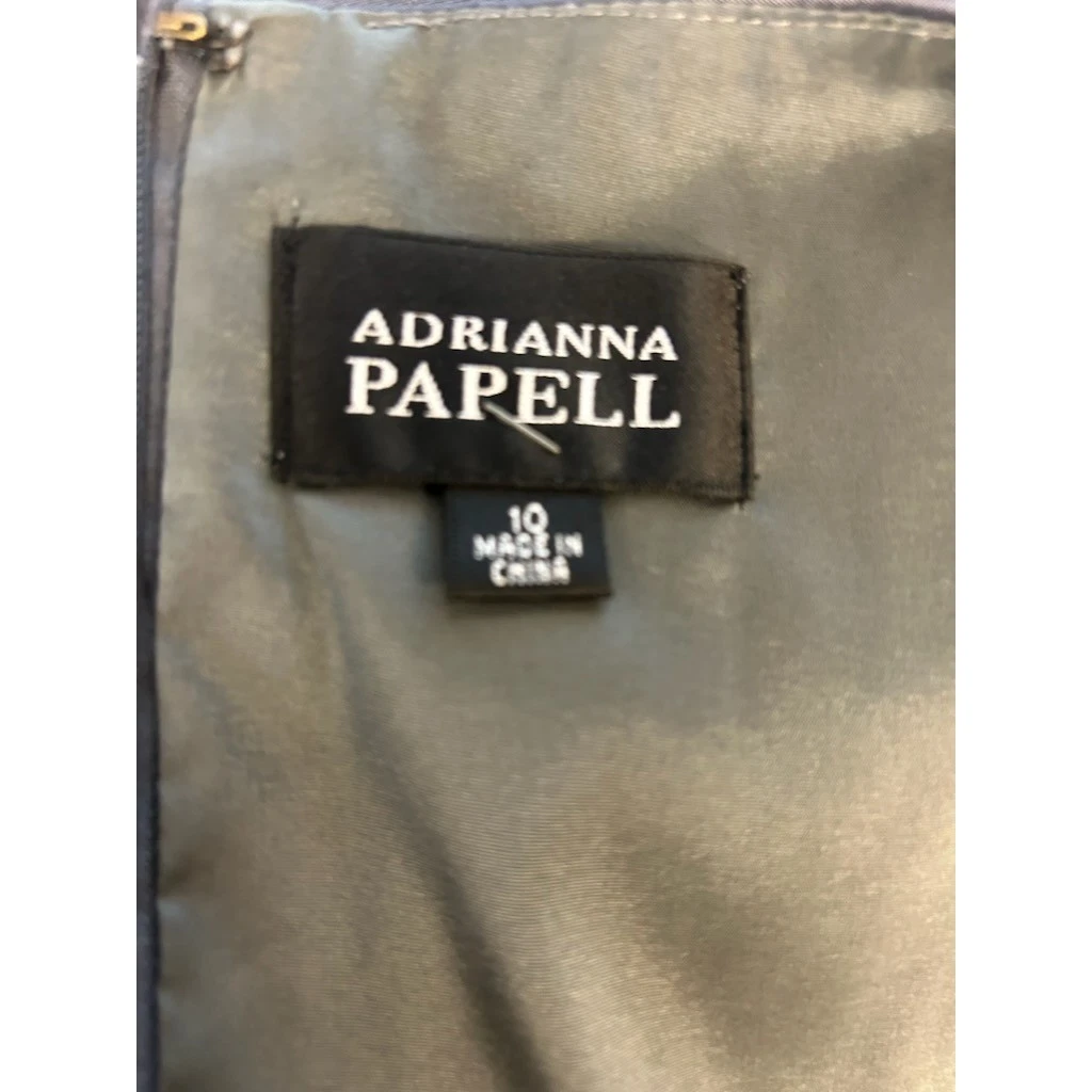 Elegant gray sheath dress by Adrianna Papell, a sophisticated addition to any wardrobe. The dress features a flattering V-neckline with tasteful pleating at the bust, enhancing the fitted silhouette. Ruched detailing at the waistline creates a slimming effect, while the sleeveless design makes it perfect for layering or wearing on its own. A concealed back zipper ensures a smooth, seamless look. This dress would be perfect for cocktail parties, career events, or evening dinners.