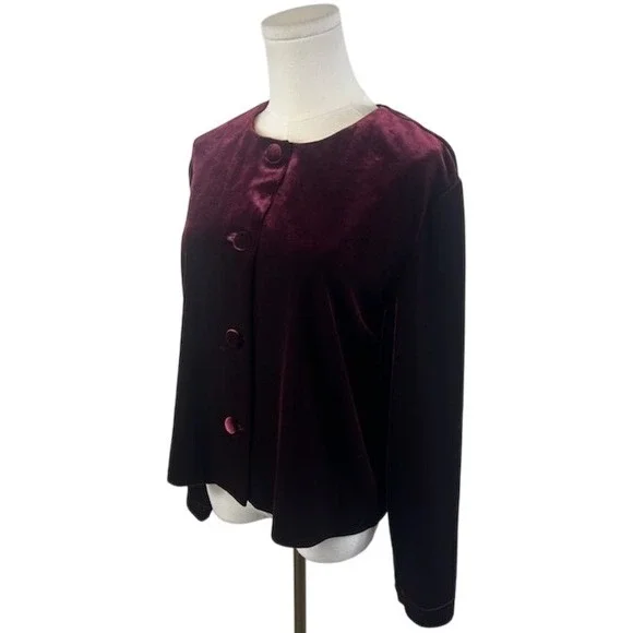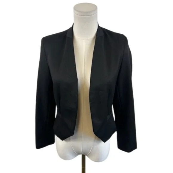 Excellent condition! Elegant open-front jacket, showcasing an artistic arrangement of shimmering patterns that catch the light beautifully. This sophisticated piece features a subtle stand-up collar and 3/4 sleeves, offering a modern twist on a classic silhouette. Its lightweight construction ensures comfort and ease of movement, making it an ideal choice for layering over dresses or tops. An excellent choice for cocktail parties, formal dinners, or special events.