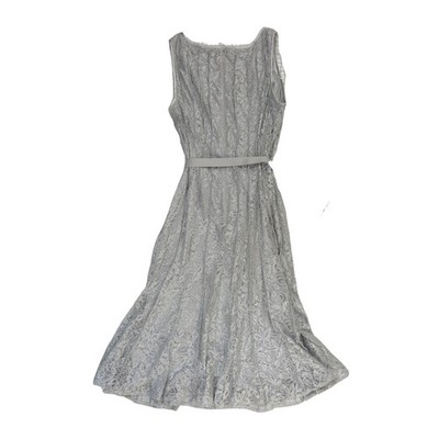 Excellent Condition, looks like new! Alex Evenings cocktail dress offers a sophisticated look with its intricate floral lace overlay and shimmering metallic thread details. The sleeveless silhouette features a classic round neckline and a flattering A-line skirt that falls to a midi length. A matching satin ribbon tie at the waist defines the figure, while the vertical pleating in the lace adds texture and visual interest. Fully lined for comfort and coverage, this elegant piece is finished with a concealed back zipper closure.