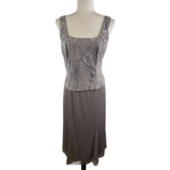 Elegant two-piece dress suit set, perfect for special occasions. This ensemble includes a sleeveless dress and a matching jacket, both adorned with shimmering silver sequins in a swirling design. The dress features a square neckline and a flattering sheath silhouette, while the jacket offers a sophisticated touch with its open-front design and three-quarter sleeves. This dress suit set is an ideal choice for cocktail parties, evening events, or mother of the bride attire, ensuring a refined and polished look.