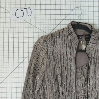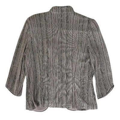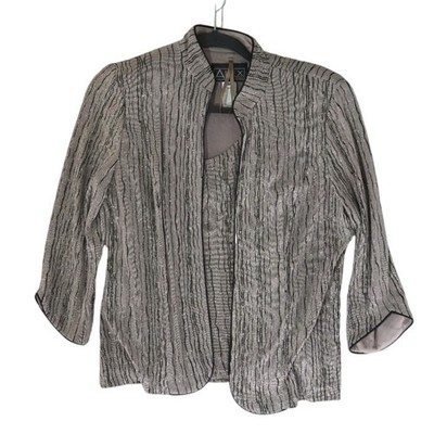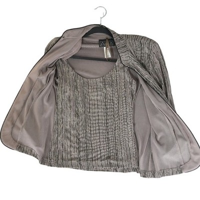 This Elegant two-piece set includes a matching tank top and an open-front jacket with a sophisticated mock neck collar and it measures approximately 22 inches in length, has a sleeve length of 16 inches, and is 15.5 inches pit-to-pit when laid flat. The fabric features a textured, vertical ripple effect in a taupe and black palette, accented by shimmering metallic silver threads for a subtle glitter finish. Designed with a comfortable stretch blend and finished with sleek satin trim, this ensemble offers a polished look for evening events or special occasions. The jacket features three-quarter sleeves and a structured yet lightweight feel, perfect for layering over the coordinated scoop-neck shell.