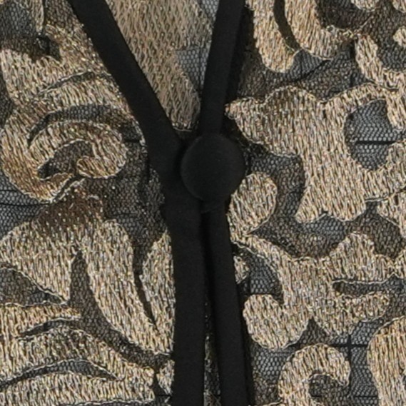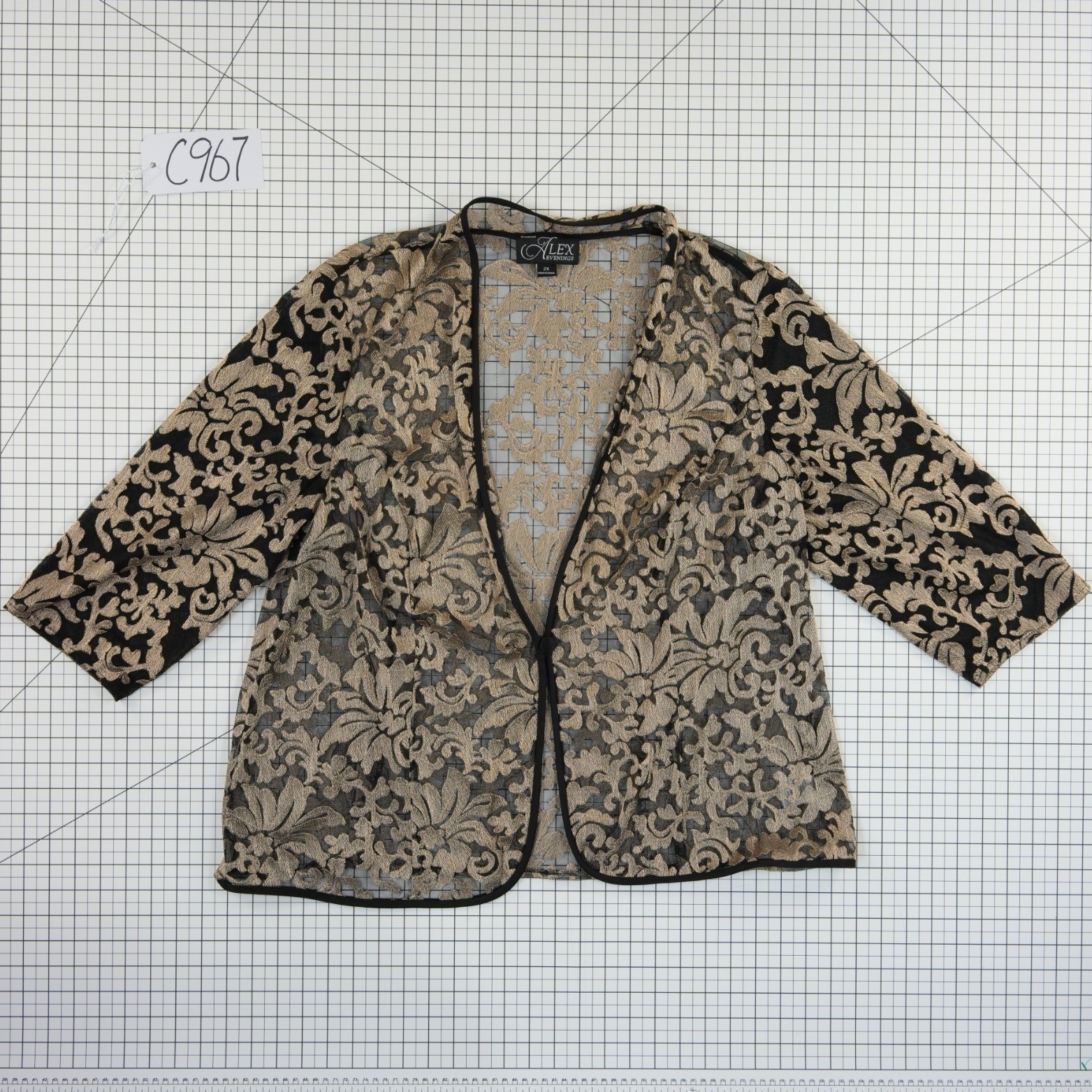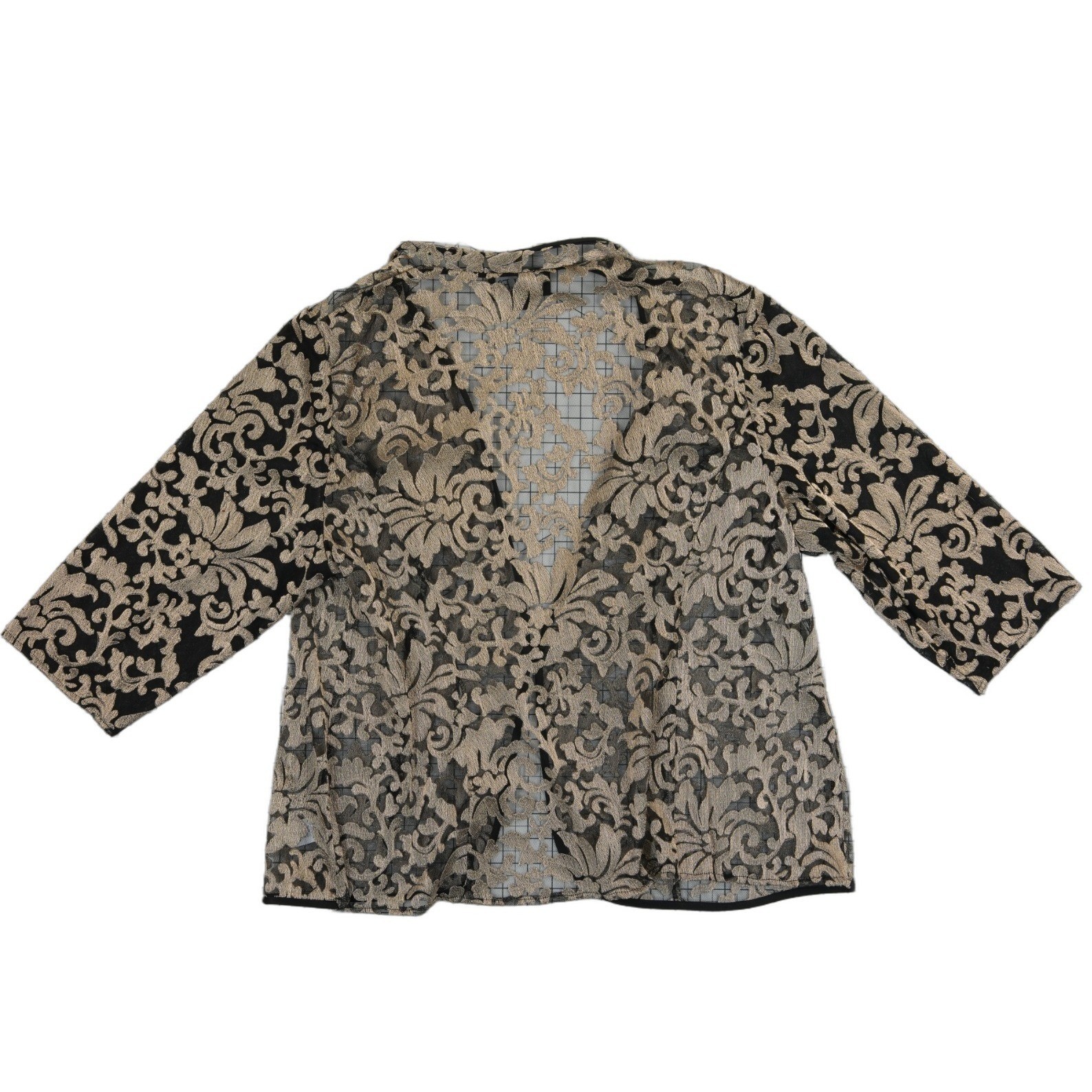 Excellent condition! Sheer mesh open-front jacket features an intricate gold metallic damask embroidery over a black fine net base. Designed with a single button closure and 3/4 length sleeves, this elegant layer offers a sophisticated silhouette for formal occasions. The lightweight construction and scalloped-style floral pattern provide a luxurious texture that pairs beautifully over a cocktail dress or evening camisole.