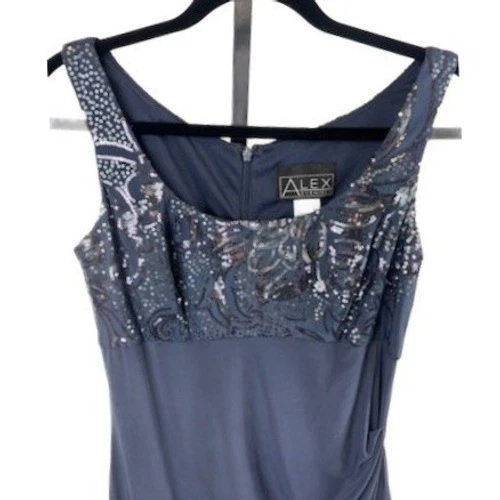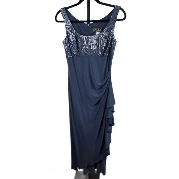 Radiate elegance and confidence in this stunning Alex Evenings ensemble, a true masterpiece designed to make you shine. The sleeveless gown captivates with its shimmering sequined bodice, intricately adorned with a mosaic of glittering embellishments that catch the light with every graceful movement. A beautifully draped skirt cascades down, featuring a sophisticated ruffle detail that adds a touch of dynamic flair and visual interest. This exquisite set is perfect for making a memorable entrance at a formal wedding, a sophisticated gala, or a celebratory evening event.