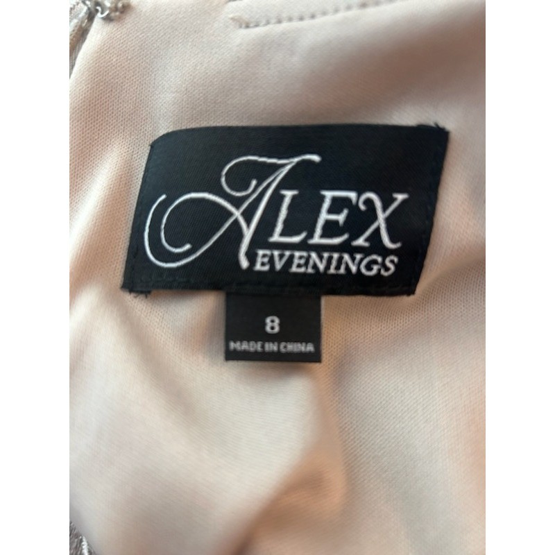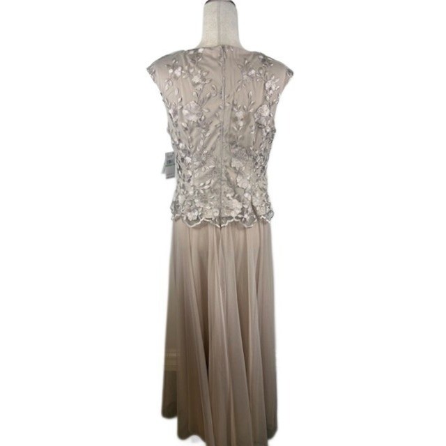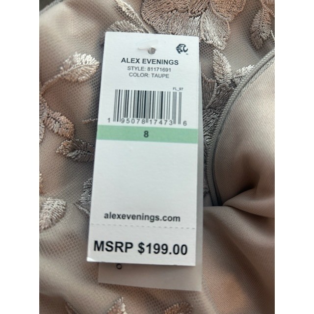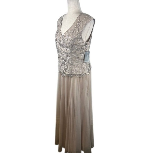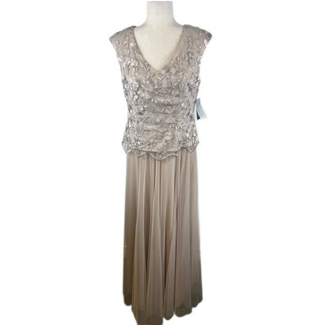 Keywords: Alex Evenings gown, taupe gown, lace bodice dress, sleeveless gown, floral embellishment dress, formal dress, evening gown, special occasion dress, wedding guest dress, mother of the bride dress, party dress, maxi dress, V-neck dress