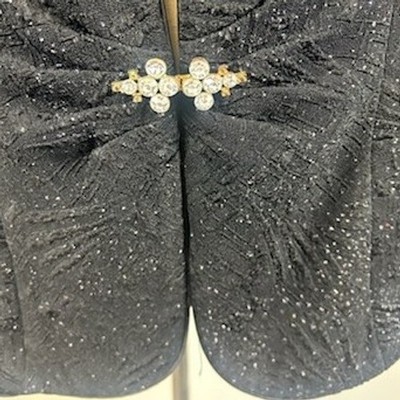 Sophisticated evening blazer in a timeless black hue, perfect for adding a touch of elegance to any special occasion ensemble. This beautiful jacket features a subtle, shimmering pattern that catches the light, creating a sophisticated look. The 3/4 sleeves add a modern touch, while the jeweled clasp closure adds a hint of glamour. Fully lined for comfort and a smooth fit, this piece is a versatile addition to your wardrobe. Ideal for cocktail parties, dinner dates, or formal events, it's sure to make a statement.