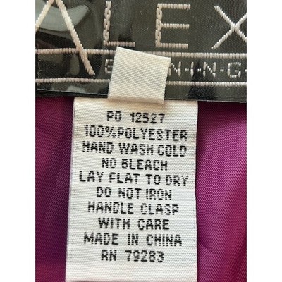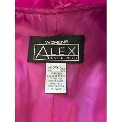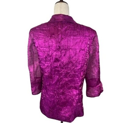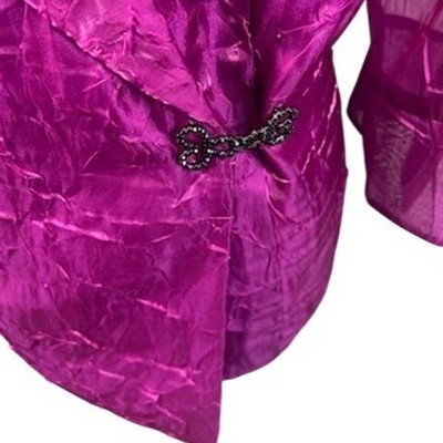 Striking evening wear, this Alex Evenings wrap blouse offers an elegant touch to any special occasion. The blouse is designed with a unique crushed velvet texture in a vibrant purple hue, enhanced by sheer fabric detailing along the sleeves and back. Featuring a flattering wrap style with a decorative clasp, this blouse adds a sophisticated flair to your outfit. Perfect for cocktail parties, evening dinners, or formal events where you want to make a memorable impression.