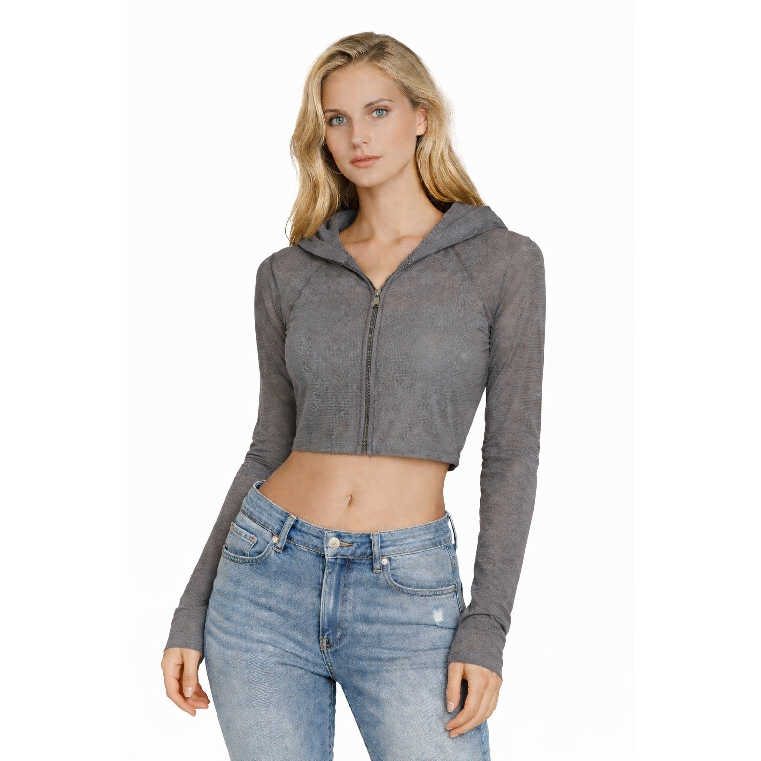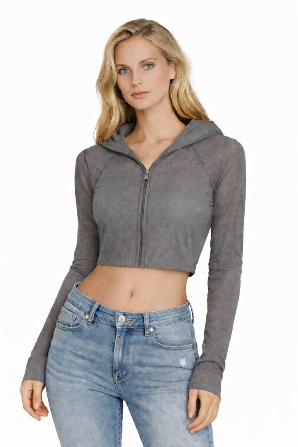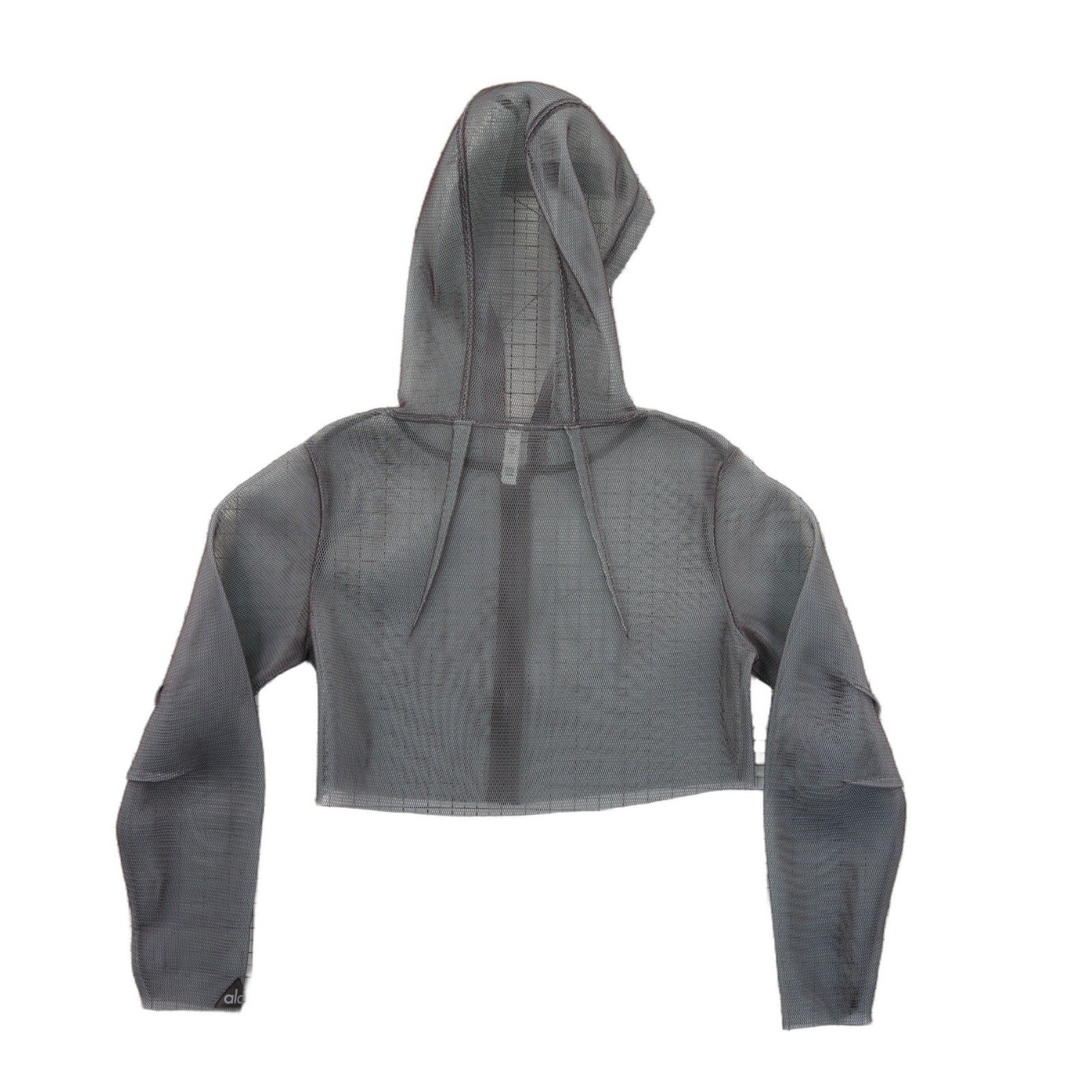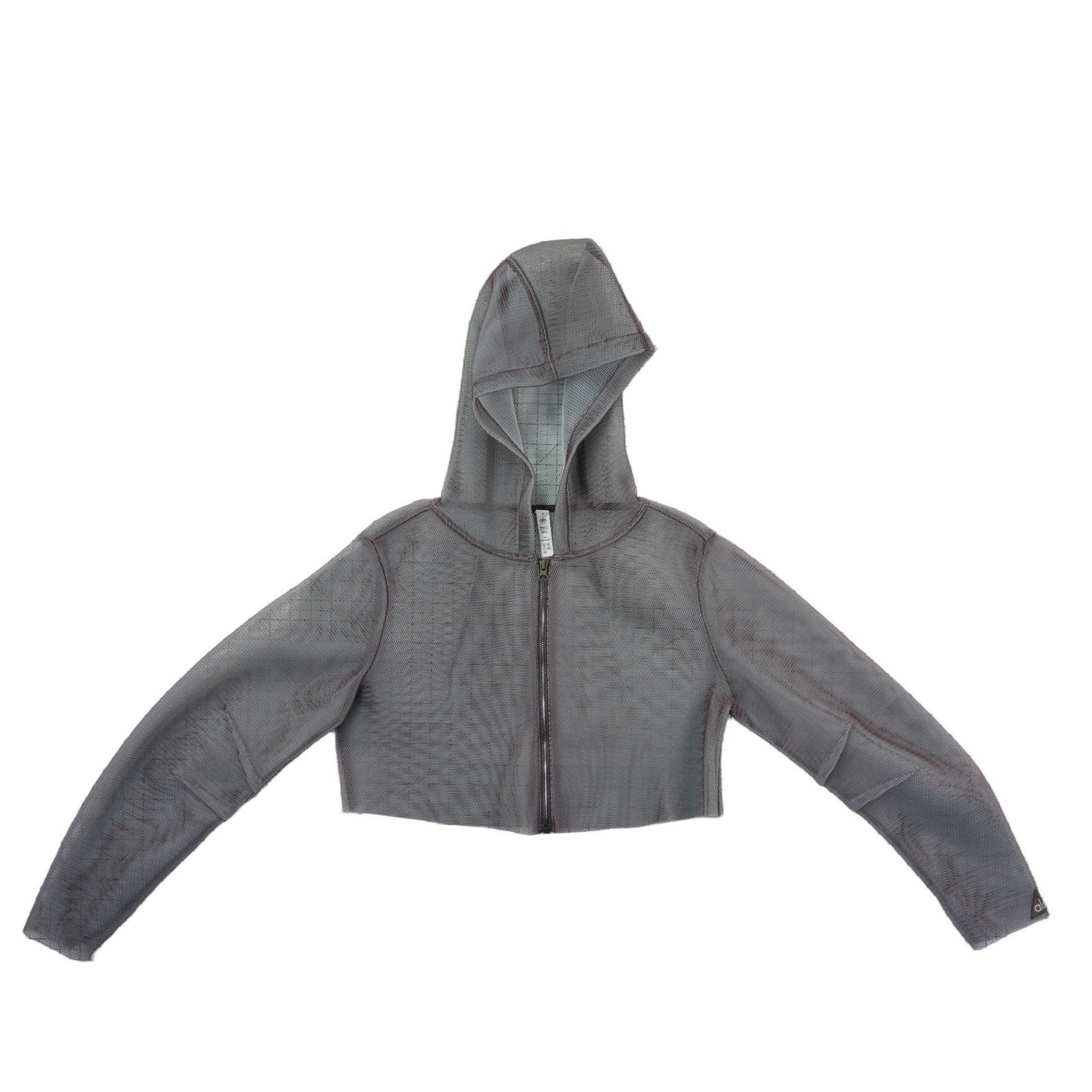 Excellent Condition! Alo Yoga mesh cropped zip-up hoodie offers a lightweight, breathable layer perfect for post-workout transitions or street-style layering. Constructed from 100% polyester honeycomb mesh, this piece features a full-zip front, a fixed hood, and a trendy cropped silhouette. The dark grey/anthracite hue and sheer texture provide a modern, edgy aesthetic that pairs effortlessly with high-waisted leggings or sports bras.
