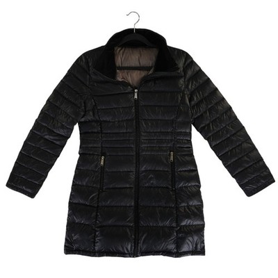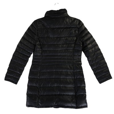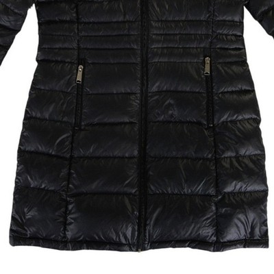 This Andrew Marc packable lightweight premium down puffer coat in a sleek black finish measures 31.4 inches in length, has a sleeve length of 19.2 inches, and is 17.5 inches pit-to-pit when laid flat. This mid-length outerwear piece features a quilted horizontal baffle design that provides warmth without the bulk, perfect for travel or daily commutes. The jacket is equipped with a full-zip front, zippered hand pockets, and a stand collar with a soft velvet-like lining for added comfort. Its streamlined silhouette offers a flattering fit while maintaining high functional performance in cold weather.