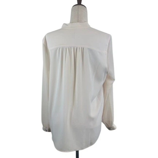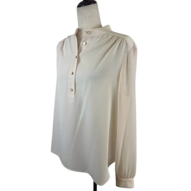 Cream long sleeve button front blouse from Anne Klein. Mandarin collar and subtle gathering at the shoulders add a touch of sophistication. This elegant top is perfect for the office or a casual outing.