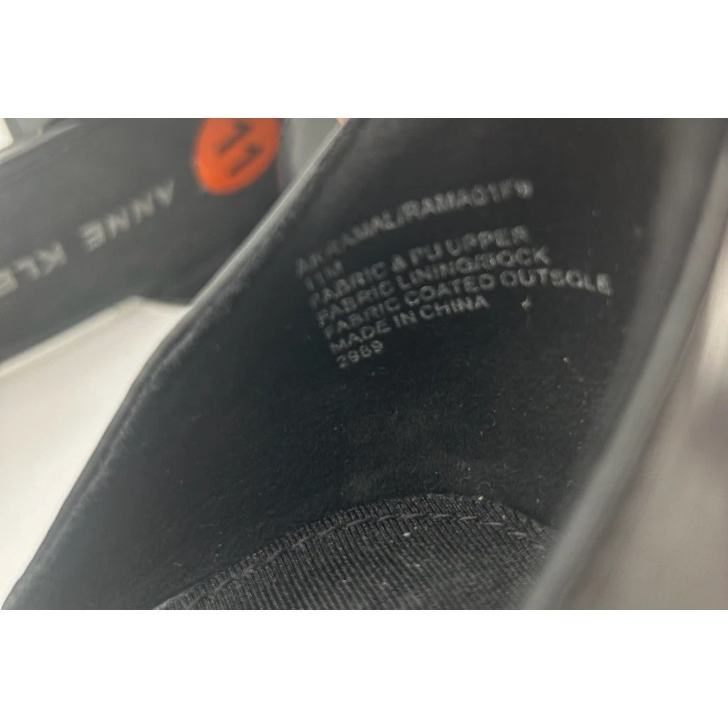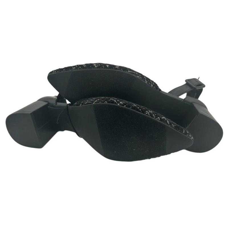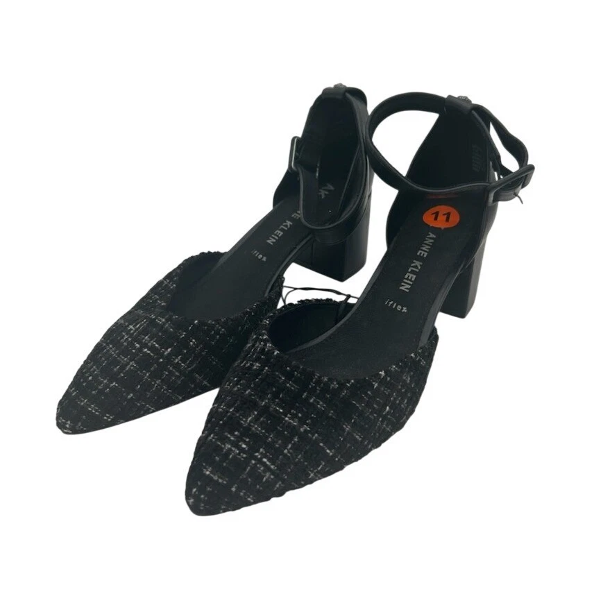Look new, no signs of wear! Chic and sophisticated, these Anne Klein pumps are a stylish addition to any wardrobe. These elegant heels feature a classic pointed toe design with a unique black tweed fabric. An adjustable ankle strap provides a secure and comfortable fit, while the block heel offers stability and all-day wearability. The shoe’s sleek silhouette is complemented by refined details, making it suitable for both professional settings and evening events. These versatile pumps are perfect for adding a touch of sophistication to your office attire, complementing a chic dinner ensemble, or elevating your favorite cocktail dress.