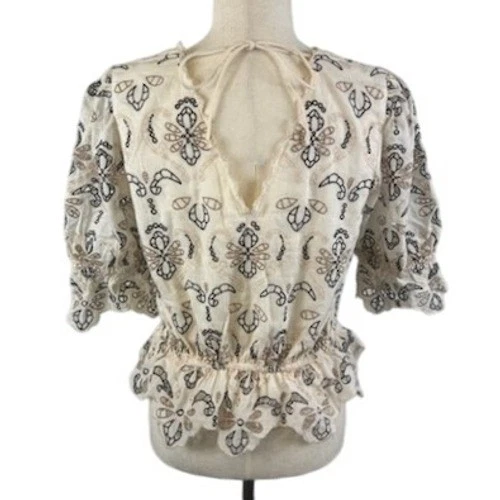 Elevated embroidery blossoms across this charming Anthropologie blouse, creating a captivating visual texture. This peasant-style top features a flattering V-neckline and an elasticated waist that cinches to define your silhouette. Ruffled detailing on the sleeves and hem adds a touch of playful elegance, while the lightweight fabric ensures breathable comfort. With an open back detail secured with a tie, this top is perfect for weekend brunches, garden parties, or a casual-chic date night.