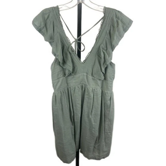 Excellent condition! Sage green mini dress by Anthropologie. This charming dress features delicate lace trim along the V-neckline and flutter sleeves. A criss-cross lace-up detail with tassel accent adorns the open back, and the empire waist flows into a gathered skirt. Perfect for a casual brunch or a summer garden party.