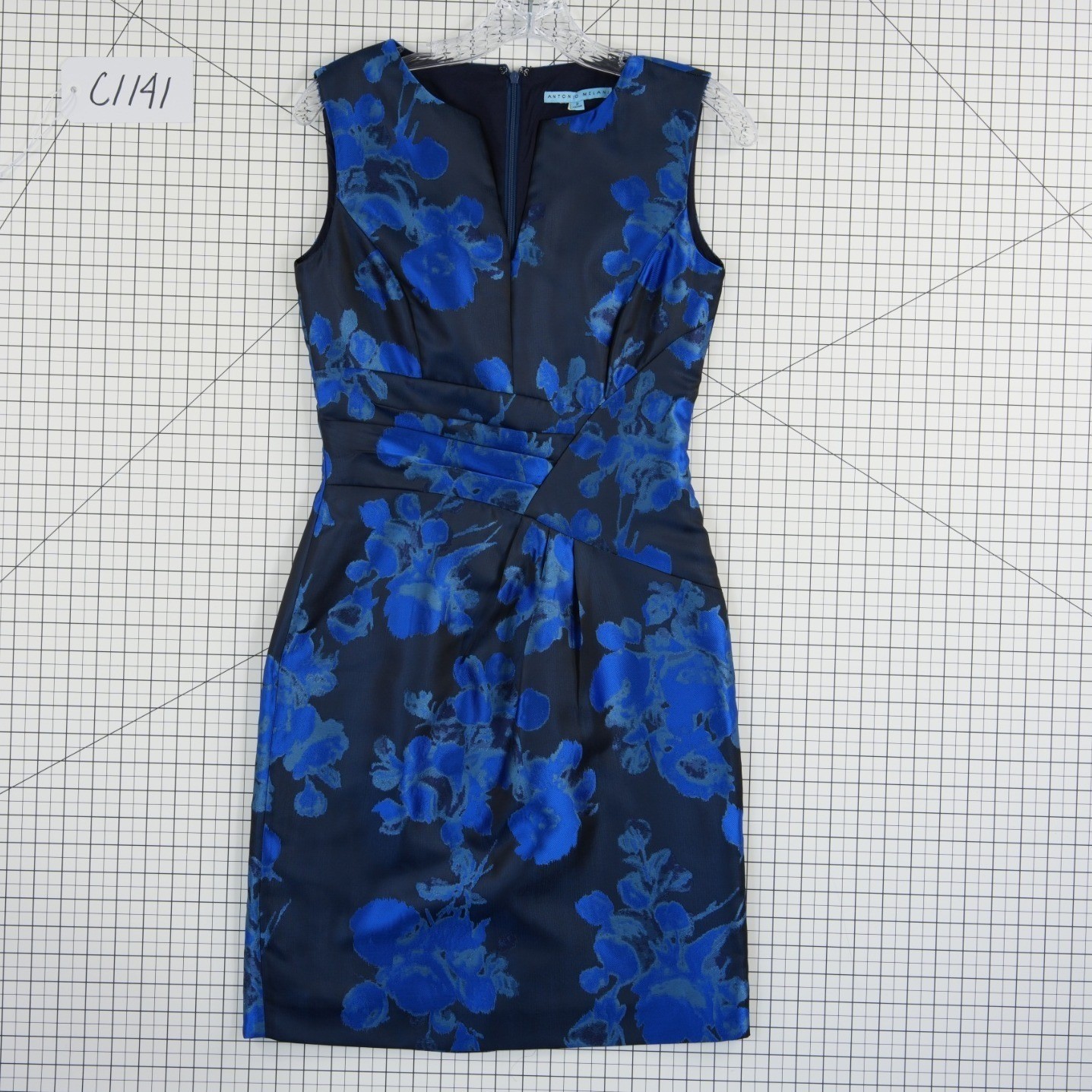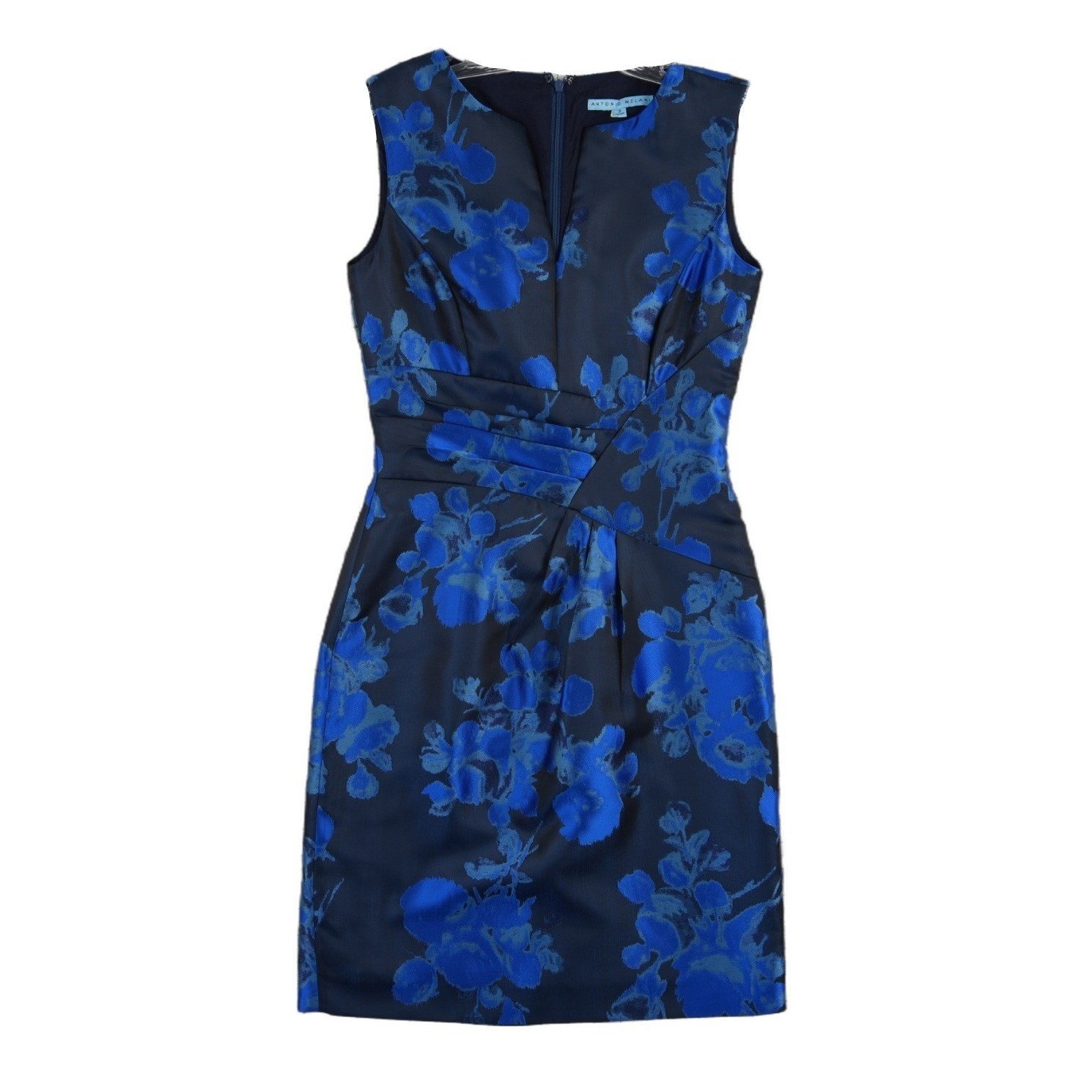 Antonio Melani sleeveless sheath dress in a striking navy and royal blue floral jacquard. This elegant piece features a sophisticated V-neckline with a subtle notch detail and a flattering pleated crossover waist that creates a tailored silhouette. The structured fabric provides a polished look, while the full lining ensures a smooth fit. Perfect for cocktail parties, weddings, or professional events, this dress combines classic floral motifs with a modern, architectural design.