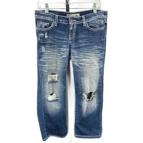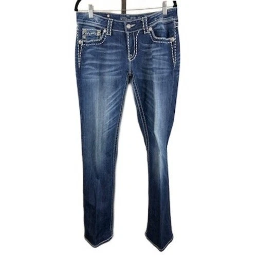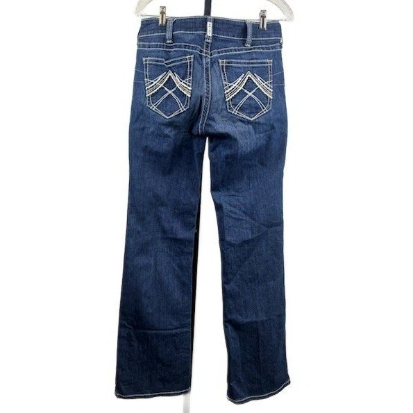 Ariat REAL Denim bootcut jeans in a medium wash. These jeans feature a classic five-pocket design with intricate white and gold stitching on the back pockets and front coin pocket. A decorative button with the Ariat logo adorns the front closure. The waistband lining showcases a subtle paisley print. Perfect for a casual day out or a country music concert.