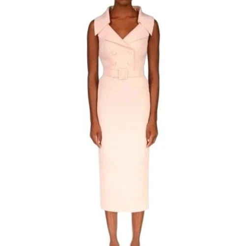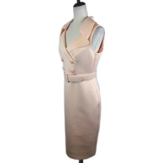 A sophisticated and chic dress, perfect for making a statement at your next event. This beautiful pale pink dress features a double-breasted design with decorative buttons and a flattering belted waist that accentuates the figure. The sleeveless cut and tailored silhouette offer a modern twist on classic elegance. Exquisite detailing ensures a polished look, whether you are attending a wedding, a business meeting, or an upscale dinner party.