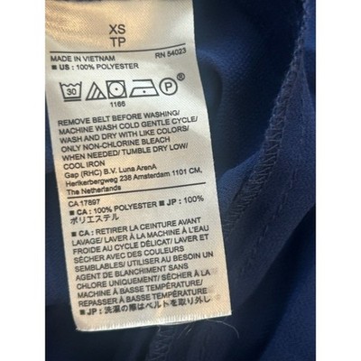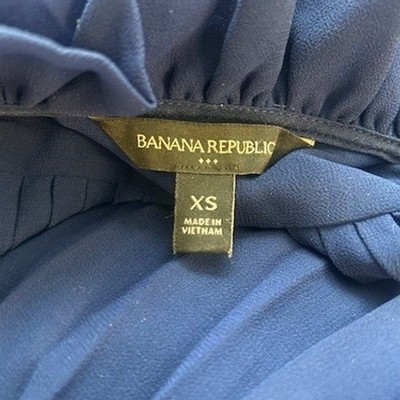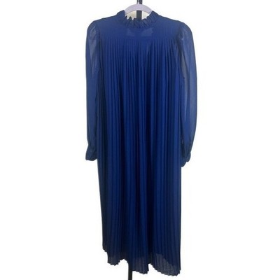 Purple midi dress by Banana Republic. This elegant dress features a flattering mock neckline with ruffle detail and bishop sleeves with button cuffs. The entire dress is adorned with fine pleats, creating a beautiful flowing silhouette. Perfect for a sophisticated evening out or a professional daytime event.