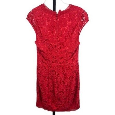 A stunning red lace sheath dress by Bebe. This elegant dress features delicate cap sleeves, a flattering V-neckline with a plunging detail, and a convenient front zipper closure. The intricate lace overlay showcases beautiful floral patterns, creating a sophisticated and feminine silhouette. Perfect for a cocktail party, a date night, or a special event.