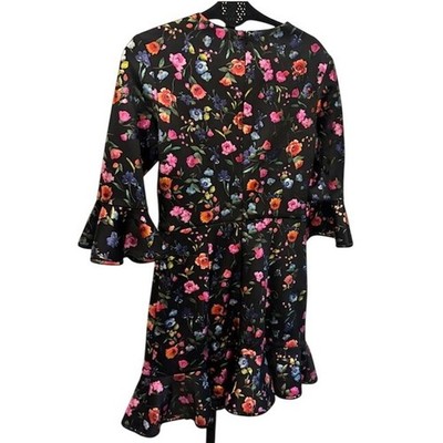 Keywords: Black Halo, Floral Dress, Ruffle Hem, Bell Sleeve, Cocktail Dress, Party Dress, Mini Dress, Black Dress, Womens Dress, Floral Print, Special Occasion, 3/4 Sleeve Dress
